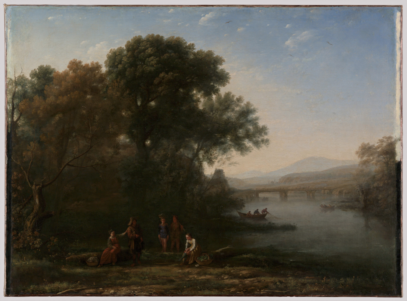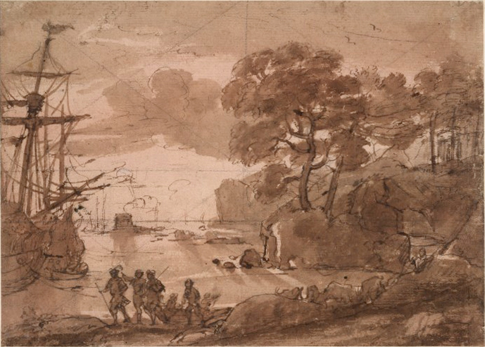 Sea coast with the landing of Aeneas in Latium, preliminary drawing for the painting; figures alighting from boats in the foreground, a shepherd with flock at right, trees on the rocky cliffs at right, ships at left. c.1650 Pen and brown ink and brown wash, touched with white; on pink-tinted paper; squared with diagonals.