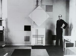 Mondrian in his atelier, circa October 1933, with Lozenge Composition with Four Yellow Lines, 1933 and Composition with Double Line and Yellow, circa 1933, unfinished
